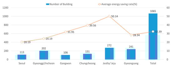 The 1065 target buildings that received design consulting were divided into regions (Seoul, Gyeonggi-Incheon, Gangwon, Chungcheong, Jeolla-Jeju, Gyeongsang) and the energy saving effects were analyzed. The administrative divisions consisting of 17 metropolitan cities and provinces nationwide were combined into Seoul, Gyeonggi-Incheon, Gangwon, Chungcheong-Daejeon-Sejong, Jeolla-Gwangju-Jeju, and Gyeongsang-Daegu-Ulsan-Busan, taking into account geographical and climatic characteristics.