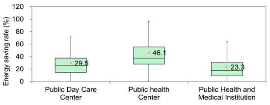 As shown in Figure 7, health centers exhibited the highest saving effect because those outside the SCA are mostly health center branches and clinics, and unlike health centers located in urban centers, many of them are small, single-family homes. As shown in Table 14, they have the smallest average total floor area and the aging of these health centers outside the SCA was found to be more severe than that of daycare centers and medical institutions.