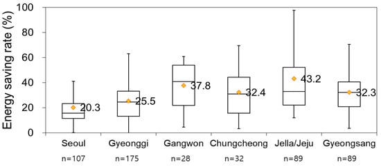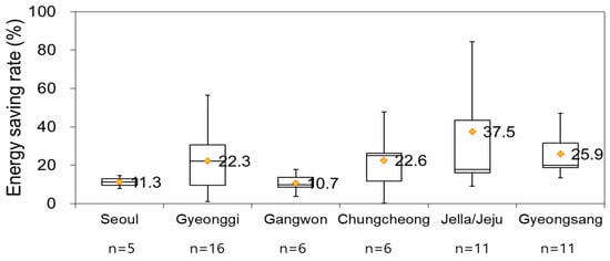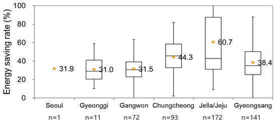 As shown in Figure 6, the energy saving rate was the highest in Jeolla-Jeju because it has the highest proportion of small-scale buildings and old buildings with several years of use, as well as the highest overall ratio of health centers reflecting green remodeling construction. The proportion of health centers in Jeolla-Jeju targeted for green remodeling was 35.1%, the largest number of health centers among all regions and 63.2% of the green-remodeled buildings in Jeolla-Jeju. Thus, the percentage of old health centers is overwhelmingly high, resulting in a substantial energy improvement effect.