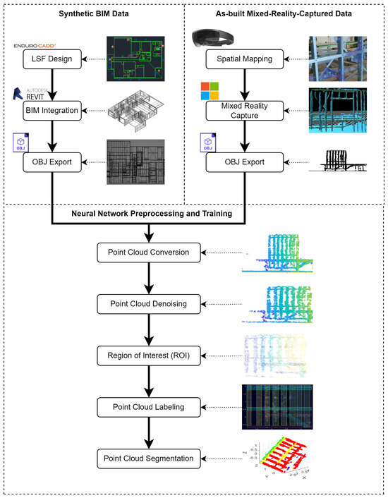 In summary, this study explored the possibility of segmenting the 3D point cloud of an LSF system using both synthetic data obtained from BIM and actual as-built data obtained directly from MR headsets. The advantage of using the 3D point cloud input from MR headsets, as opposed to existing 2D approaches, lies in its ability to process spatial information more accurately, allowing for depth perception in future automated inspection-related tasks. This study aimed to ascertain the viability of utilizing synthetic data as a supplementary measure due to the scarcity of actual as-built data due to the extensive resources needed to procure LSF frames. A CNN-based approach was used to segment the LSF frames, facilitating the construction monitoring process. Five distinct experiments were conducted using synthetic and actual data and a hybrid mix of both to train and test the model’s performance. We assessed the efficacy of synthetic data generated from BIM models in enhancing a neural network’s performance in the point-cloud-based segmentation of an LSF system. The experiments showed that introducing synthetic data improves the model’s overall performance, with an average testing accuracy of 86.15%, as opposed to solely relying on actual data, which had an average testing accuracy of 82.88%. This demonstrated the benefits of the hybrid effects of synthetic data and as-built scans obtained directly from MR headsets in actual construction scenarios. Nevertheless, the whole dataset, which contains 10 synthetic and 10 actual LSF frames, only consists of 92,319 data points. Therefore, further study should be conducted before drawing a firm conclusion based on these results. In addition, the model trained on a hybrid dataset demonstrates an ability to recognize both BIM data and as-built data captured using the MR headset at an average accuracy of 79.55%. This enables the real-time monitoring of construction progress, allowing for the immediate identification of structural deviations from the planned designs. In future, the authors hope to extend this study to cover a wider range of structural elements, such as roofing systems constructed using LSF. In addition, it would be beneficial to study the applicability of the automated segmentation of structural elements to other structural systems, such as concrete structures. Finally, although the current developed methodology can only recognise these types of structural elements, the authors hope to utilise this point cloud segmentation to develop an automated inspection system to recognise the dimensional and geometrical properties of every structural element in the near future. The authors strongly believe that visual scene understanding using AI will improve the efficiency of progress monitoring and inspection tasks, playing a pivotal role in construction’s digitization.