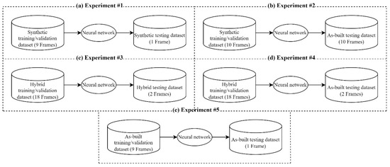 After the points have been assigned labels, the points are separated into three subsets: the training, validation, and testing datasets. The combination of synthetic data and as-built mixed-reality-captured data totals to 92,319 points after pre-processing. To investigate the effects of synthetic, as-built, and hybrid datasets, we established a total of five distinct experiments, as shown in Figure 4.