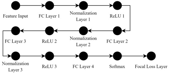 The first fully connected layer network had 1,024 neurons, followed by 512 and 256 neurons in the subsequent fully connected layers, and their activations were normalized. We also introduced non-linearity by outputting zero for negative input values and passing positive values directly through. A softmax activation function was used before the focal loss layer, whereby the focal loss function, L, was computed using Equation (7) [37].
