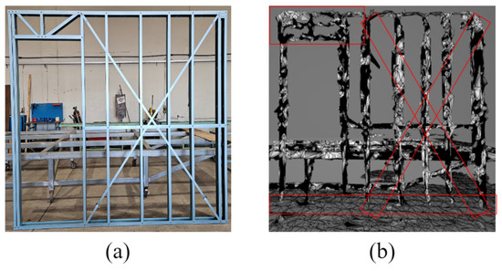 Some notable limitations were identified during the data collection process using the MR headset as well. Firstly, the MR headset tends to fail to capture bracing elements, which are 1 mm thick and 30 mm wide, as shown in Figure 8a,b. Secondly, it has difficulty in distinguishing the bottom plate from the floor, as shown in Figure 8b. Its spatial maps often depict rough surfaces, smoothing out any irregularities that might represent thin structural elements, such as bottom plates. Lastly, the raw capture of the MR headset tends to contain floating objects; however, most outliers have been removed using the method described in the research methodology.