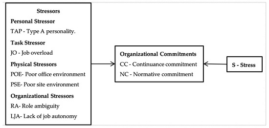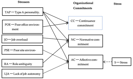 In this study, the relationships confirmed from regression analysis are included in the final model as shown in Table 3. The complex relationships between stressors (Type A personality, poor office environment, poor site environment, job overload, role ambiguity, and lack of job autonomy) and organizational commitment and between stress and organizational commitment for engineers are illustrated in the Stressors/Stress–Organizational Commitment model (see Figure 2).