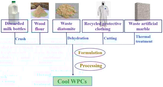 Therefore, in this study, discarded milk bottles are used as the matrix, and wood flour, recycled protective clothing, and diatomite from brewery waste are added as reinforcing agents. Additionally, pre-treated waste artificial marble powder is incorporated, with maleic anhydride grafted polyethylene (MAPE) used as a compatibilizer to enhance the interface compatibility between the resin and additives. [,,]. This is a cost-effective approach to obtaining outdoor cool WPCs or roof heat-insulating layers to achieve a cooling effect. This can mitigate damage to the human body from high temperatures, reduce indoor air conditioning usage, and contribute to the objectives of a circular economy and sustainable carbon reduction.
