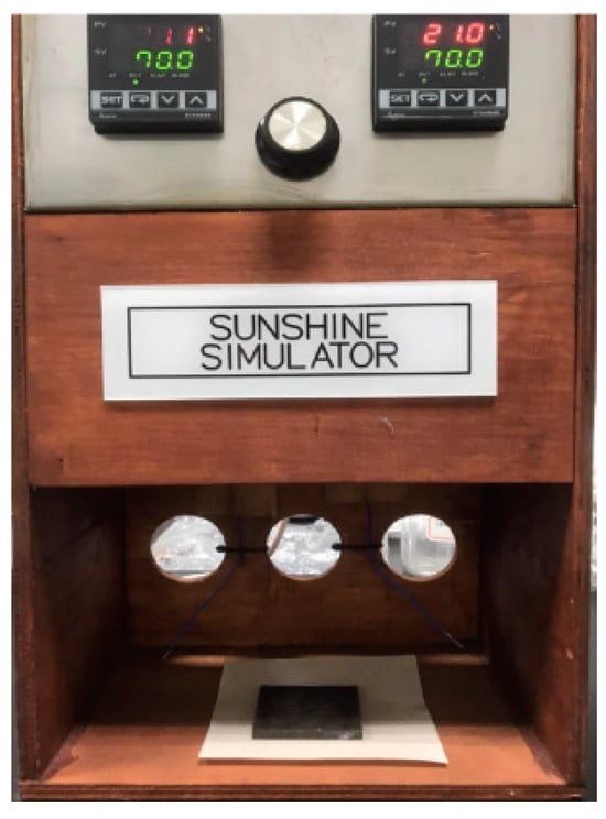 The thermal decomposition behavior of waste artificial marble powder and WPCs was determined via thermogravimetric analysis (TGA) using TGA Q50, TA Instruments, Inc. (New Castle, DE, USA). All samples, approximately 10 mg each, were scanned from 50 to 600 °C at a heating rate of 10 °C/min under nitrogen flow. X-ray Diffraction (XRD) analysis of samples was conducted at an angular incidence of 0° to 75° using a PANalytical X’Pert PRO (Malvern Panalytical Ltd., Almelo, The Netherlands) with Cu-K radiation (λ = 0.154 nm) at a scanning rate of 10°/min. To study the mechanical performance of the WPCs, all samples were conditioned at 65% relative humidity and 23 °C until equilibrium moisture content was achieved before testing. Five specimens of each sample were used for testing, and the average values were calculated from the obtained results. The tensile tests were carried out following the ASTM D638 test method with a load cell of 20 kN and an extension rate of 50 mm/min using an Instron universal tester (HT-9102, Hung Ta Instrument Co., Ltd., Taichung, Taiwan). A dumbbell-shaped test specimen of 186 mm × 19 mm × 3 mm was then prepared and tested at room temperature. Meanwhile, strip-shaped specimens (127 mm × 12.7 mm × 3.2 mm) were produced for flexural tests following ASTM D790. The three-point flexural tests were conducted using a universal testing machine (HT-9102, Hung Ta Instrument Co., Ltd., Taichung, Taiwan) with a crosshead speed of 3 mm/min. A thermal conductivity detector (TCD, Hot Disk, TPS-500, Gothenburg, Sweden) was employed to measure the thermal conductivity of the WPCs. The samples were compressed into dimensions of 5 cm (L) × 5 cm (W) × 0.5 cm (H) before being placed into the detector. The operating power and time were set at 50 mV and 40 s, respectively. Upon the exposure test, the WPCs were subjected to simulated sunlight using equipment (Figure 2), and the surface temperature of the WPCs was analyzed using an infrared camera (FLIR Cx-Series® Compact Thermal Imaging Camera, Teledyne FLIR, Wilsonville, OR, USA).