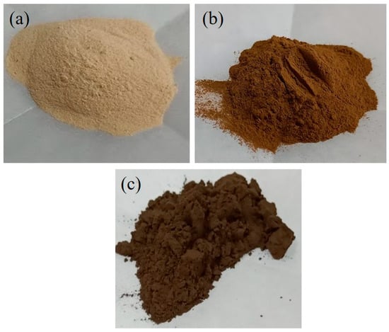 Appearance of waste artificial marble powder after heat treatment at (a) 300 °C, (b) 400 °C, and (c) 500 °C.