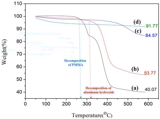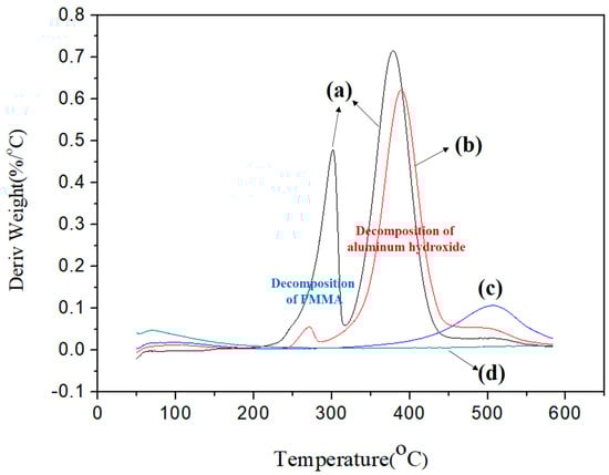 The primary components of artificial marble are polymethyl methacrylate (PMMA) and aluminum hydroxide. Due to the decomposition of PMMA in artificial marble and the requirement that the temperature for converting aluminum hydroxide to alumina must exceed 250 °C, we selected 300 °C, 400 °C, and 500 °C to perform the thermal treatment of artificial marble. Figure 3 illustrates the appearance of waste artificial marble powder after heat treatment at 300 °C, 400 °C, and 500 °C, respectively. It can be observed that as the heat treatment temperature increases, the material color gradually darkens. Figure 4 and Figure 5 depict the thermogravimetric analysis (TGA) and differential thermogravimetric analysis (DTG) of waste artificial marble powder after different temperature treatments. The substance decomposing around 270 °C is identified as PMMA, and at 320 °C aluminum hydroxide begins to decompose. Figure 4 (a) shows a significant weight loss around 270 °C, suggesting a higher PMMA content in the original artificial marble powder compared to the thermally treated samples (Figure 4 (b–d)). Moreover, the results indicate that with an increase in heat treatment temperature, the material’s weight loss decreases, and the char yield increases from 40.07% to 91.77%. This suggests that aluminum hydroxide gradually dehydrates and transforms into aluminum oxide during the heating process. The transformation of aluminum hydroxide into aluminum oxide will enhance the thermal stability, thermal conductivity, and mechanical properties of the powder. Figure 5 (a) illustrates the distinct decomposition peaks of PMMA and aluminum hydroxide in the original artificial marble powder treated at 300 °C. However, a significant reduction in the peak of decomposition around 270 °C after heat treatment (Figure 5 (b–d)), indicating that most of the PMMA has decomposed. The decomposition of PMMA increases the aluminum oxide content in the powder, thereby improving its thermal stability, thermal conductivity, and mechanical properties. Due to the excessively dark color and the lack of significant differences in char yield (91.77%) compared to the 400 °C heat-treated sample (84.57%), the waste artificial marble powder treated at 500 °C is not selected for further study. Considering the reasons mentioned above and energy cost considerations, we have decided to proceed with additional research using the waste artificial marble powder treated at 300 °C and 400 °C.