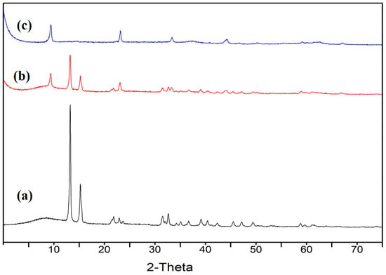 The XRD analysis presented in Figure 6 reveals that the characteristic peaks of aluminum hydroxide are located around 13° and 16°, whereas the characteristic peak of aluminum oxide appears around 10°. The pronounced peaks at 13° and 16° in Figure 6 (a) signify the predominance of aluminum hydroxide in the original artificial marble powder. After the heat treatment at 300 °C, the peaks around 13° and 16° significantly diminish, and a new peak around 10° appears in Figure 6 (b). This indicates that, following heat treatment, aluminum hydroxide has progressively dehydrated, converting into aluminum oxide. Furthermore, the peaks around 13° and 16° were almost undetectable, and the peak at 10° increased significantly in Figure 6 (c), indicating that the majority of the aluminum hydroxide had converted to aluminum oxide after being thermally treated at 400 °C.
