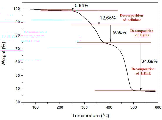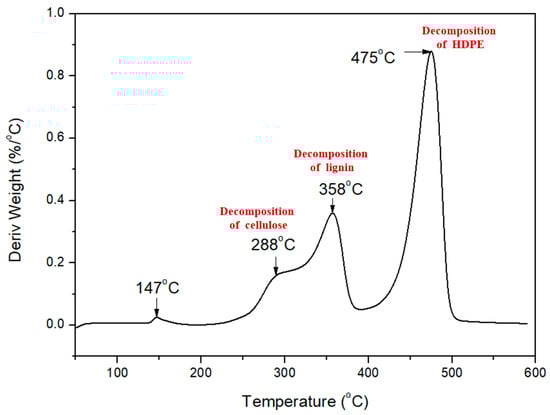 Figure 7 and Figure 8 depict the TGA and DTG analysis of the T4-D12 composite. The thermal degradation behavior of the composite is crucial, as it impacts its processing parameters and long-term performance, especially regarding recyclability and environmental impact. Figure 7 illustrates that the decomposition of cellulose begins at approximately 288 °C, resulting in a weight loss of 12.65%. Following this, lignin decomposes at around 358 °C, with a weight loss of 9.96%. Additionally, HDPE from discarded milk bottles decomposes at about 475 °C, leading to a weight loss of 34.69%. The final char yield is approximately 25%. The high char yield will enhance the mechanical properties and durability of the WPCs, particularly in outdoor or high-temperature environments. From Figure 7, it is evident that the proportion of HDPE from discarded milk bottles, at 34.69%, closely aligns with the amount incorporated into our formulation, which is 34%. This suggests that during processing, HDPE from discarded milk bottles and other components mix stably without significant loss. Moreover, the DTG analysis of the T4-D12 composite, as shown in Figure 8, reveals that the composite comprises three main components. Their decomposition temperatures correspond to 288 °C, 358 °C, and 475 °C, respectively.