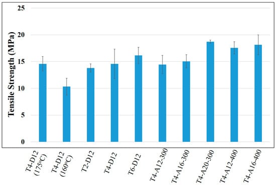 From the results of the tensile strength analysis presented in Figure 9 and Table 2, it is evident that, for the same formulation (T4-D12), the tensile strength of the material processed at a compounding temperature of 175 °C (14.59 MPa) is significantly higher than that of the material processed at 160 °C (11.11 MPa). Therefore, for subsequent material formulations, the processing temperature is set to 175 °C.