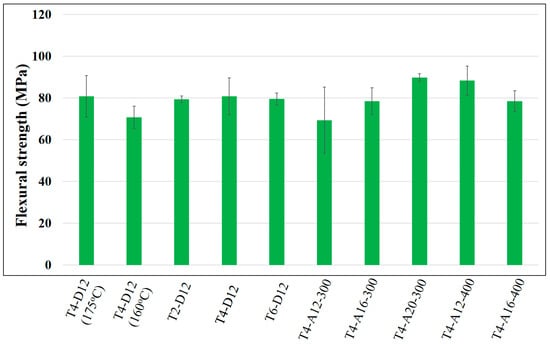From the analysis of flexural strength shown in Figure 10 and Table 3, it is observed that the flexural strength of T4-D12, processed at a compounding temperature of 175 °C (80.80 MPa), is higher than that of the material processed at 160 °C (70.75 MPa). With an increase in the amount of recycled Tyvek®, there is no significant difference in the material’s flexural strength. Additionally, the WPC incorporating 20% of waste artificial marble powder treated at 300 °C, replacing diatomite and some wood flour (T4-A20-300), exhibits the highest flexural strength (89.76 MPa). This indicates that waste artificial marble powder treated at 300 °C demonstrates superior rigidity compared to wood flour. This result is consistent with the tensile strength analysis. Mazzanti et al. [] prepared wood flour-filled polyethylene using 4 wt% of MAPE as a coupling agent, resulting in a flexural strength of 21.23 ± 0.77 MPa for the produced WPC. In comparison, the flexural strength of the WPCs in this study can reach up to 89.76 ± 5.05 MPa, which is significantly higher than the reference value. This increase is attributed to the reinforcing effect of recycled Tyvek® and thermally treated waste artificial marble powder.