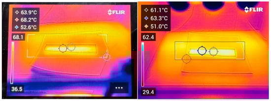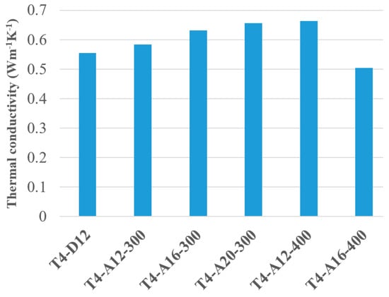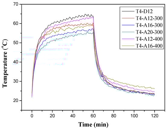 The results of the thermal conductivity analysis (Figure 13 and Table 5) reveal that the thermal conductivity of the WPCs increases with the addition of waste artificial marble powder treated at 300 °C. Furthermore, for the WPCs containing waste artificial marble powder pre-treated at 400 °C (T4-A12-400), the thermal conductivity is significantly higher, rising from the non-added value of 0.5543 Wm−1K−1 to 0.6634 Wm−1K−1. This is attributed to the waste artificial marble powder pre-treated at 400 °C, which undergoes a more extensive transformation from aluminum hydroxide to aluminum oxide through dehydration, resulting in a noticeable improvement in thermal conductivity. However, as the content of waste artificial marble powder treated at 400 °C increases (T4-A16-400), the thermal conductivity is affected due to the larger and more uneven particle size of the alumina treated at 400 °C, which causes uneven dispersion. Consequently, the thermal conductivity coefficient decreases (0.5047 Wm−1K−1). Therefore, the heat dissipation effect of the material under illumination is not as effective as that of the WPCs incorporating waste artificial marble powder treated at 300 °C.