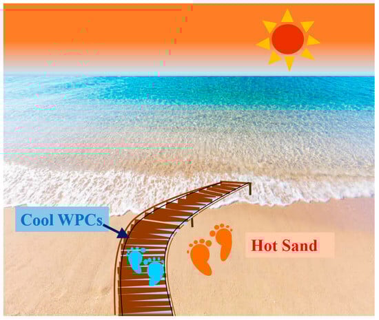 This popularity can be attributed to their water resistance, ease of processing, recyclability, and environmental friendliness [,]. Classified as green composites, WPCs not only originate from sustainable sources of raw materials but are also recyclable, making them a promising choice for reducing production costs and improving resource reuse efficiency through cascade utilization []. Recently, there has been a growing interest in the use of WPCs in the construction field, driven by an increasing awareness of environmental protection and sustainability. This interest is fueled by benefits such as reduced reliance on traditional wood sources, decreased waste generation, and a lower carbon footprint compared to conventional materials, thereby promoting a circular economy.