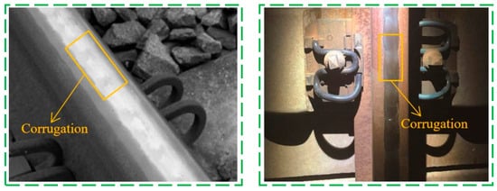 Rail corrugation is periodic wear along the longitudinal surface of the rail after repeated rolling by wheels [32] and has a relationship with the inherent characteristics of the vehicle track. Its formation and development process will lead to the reduction of train comfort, safety, and stability. By aggravating the vibration damage of vehicle track parts, in serious cases, it will lead to vibration fatigue damage or the fracture of some parts (such as fasteners, track plates, sleepers, frames, and axle boxes), affecting the safety of train operation.