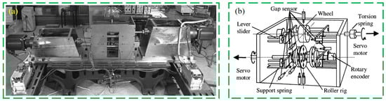 Matsumoto et al. [18] established a mathematical model to explain the formation mechanism of corrugation through experimental tests. The relative position of the bogie and track in curving is mastered by creating non-contact measurement methods. Liu and Wang [19] developed a model of torsional vibration in the time domain to explain the reason why most corrugations occur on the inner rail. The model also proves that the torsional vibration amplitude increases with the curvature of the rail. What is more, Suda et al. [20] analyzed the measured experimental data in detail through wavelet analysis and concluded that the development mechanism of rail corrugation is caused by the following reasons. (a) Steady-state longitudinal slip is a critical influence factor, that will determine the type and wavelength of corrugation, the wear rate of rails, and the developing process of corrugations. (b) Rails will form short-pitch corrugation in the condition of low creepage. (c) If the slip condition is relatively large, long-wavelength corrugation will appear. (d) The formation mechanism of corrugations is related to the wear rate and can also be explained by the phase relation between the corrugation profile, contact load, and slip. The physical drawing of the corrugation simulator and outline of the corrugation simulator are shown in Figure 2.