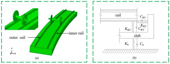 (a) Configuration of wheel–rail system; (b) geometric relationship diagram of rail and slab [21].