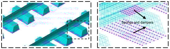 The simulation results show that the saturated creep force will cause the self-excited vibration of the wheel–rail system and lead to rail wrinkling. The effects of contact angle and saturated creep force direction on the self-excited vibration of the front wheelset–crawler system are studied. The transverse saturated creep force produces rail corrugation more easily than the longitudinal saturated creep force [25]. The detailed layout of springs and dampers is shown in Figure 4.