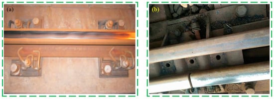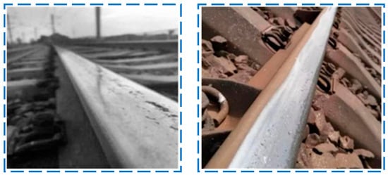 The initiation of rail corrugation causes severe vibration of rolling stock and the track structure, which does serious harm to the track structure. The surface irregularity causes the sharp increase of the wheel–rail force, which greatly shortens the service life of relevant parts of the locomotive and vehicle and track structure. Furthermore, the rail corrugation is also prone to cause serious damage to the subgrade, resulting in an increase in the damage rate of various parts of the line, which greatly increases the relevant maintenance workload and maintenance cost of the public works department. Meanwhile, the vibration and noise generated by rail corrugation are prone to cause discomfort to passengers and seriously affect the train-riding environment. In addition, corrugation will also increase the running resistance of the train. If the disease is serious, under the influence of wheel–rail force, not only the track bed will be damaged but the axle and rail may also be broken, which will seriously endanger the safety of train operation [35]. Figure 6 shows rail damage on site.