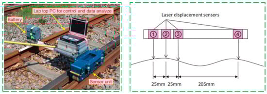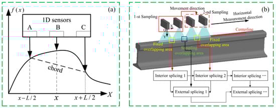 Generally, in addition to the aforementioned detection methods, many other research schemes are also investigated in this study. Gomes et al. [68] developed a software tool to analyze the railcar bogie accelerometer signal and quantify the track corrugation on the basis of its frequency and amplitude. The tool is compared with the power representation of a one-third octave filter used in industry. It was shown that the proposed tool can produce better results. Also, Bayesian methods can also be employed for rail-condition assessment [69,70,71,72,73,74]. Moreover, Xie et al. [75] presented an intelligent identification method of rail corrugation based on axle box acceleration based on a one-dimensional convolutional neural network (1-dcnn). A “spatial domain” cutting method is proposed to construct the appropriate 1-dcnn structure and configuration parameters, thus realizing the automatic extraction and classification of the input sample set data. In addition, the resolution of rail corrugation location and detection can be arbitrarily adjusted by setting the length of the “space window”. The results indicate that the proposed 1-dcnn method can identify and locate rail corrugations effectively, quickly, and stably. What is more, Teng et al. [76] built a new measurement system, named the 2D-RCM system, by using two-dimensional laser displacement sensors, as shown in Figure 12. The system can completely cover ultra-shortwave and shortwave waveforms in one sampling and obtain the original multi-point data along the laser line directly. Finally, the accurate restoration of the corrugated rail is completed through the data-splicing method. The experimental results demonstrate that it has high precision in measuring the wavebands of corrugation varied from 10 mm to 1 m. Figure 12 shows the schematics of the traditional rail-corrugation measurement method.
