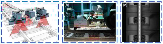 Configuration of image-acquisition subsystem. (a) the schematic diagram of image acquisition; (b) the real scene picture of this subsystem; (c) an example of track images captured by this system [57].