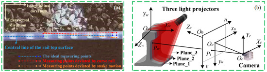 (a) Ideal measuring point and deviation measuring point; (b) schematics of the triple-line structured-light vision model [62].