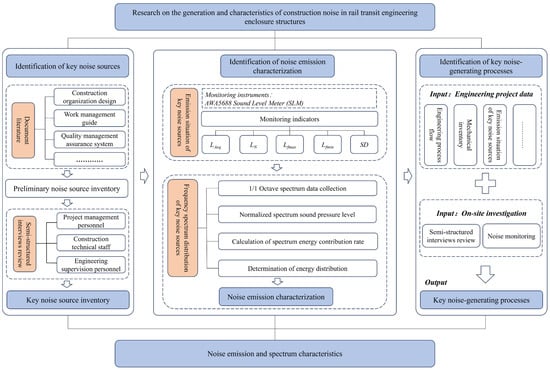 The environment of a construction site involves frequent process interlacing, equipment turnover, worker activities, etc. This dynamic construction environment poses significant challenges to identifying and monitoring the noise sources, including noise-emitting machinery and noise-generating construction processes. Therefore, this study initially reviewed engineering documents and literature to sort and identify the machinery and construction processes that may generate noise pollution and to form a list of preliminary noise source inventory. Subsequently, key noise sources in the construction of rail transit engineering enclosures were identified through an on-site survey and semi-structured interviews. The noise characteristics of these key noise sources were then identified and measured using a well-designed noise monitoring method. Finally, the key noise construction processes were identified by locating the key noise sources in the construction processes. The research framework is shown in Figure 1.