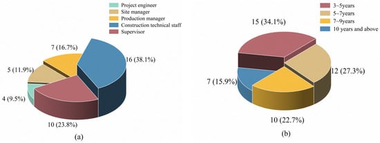 To further identify the key noise sources and key noise processes during the construction of urban rail transit engineering enclosure structure, as well as to develop a reasonable empirical research program, this study conducted a series of on-site surveys on the Shenzhen Urban Rail Transit Line 7 Phase II (East Extension) project from May to July 2023, and semi-structured interviews were conducted on 42 on-site construction and management personnel. The interview questions can be found in Supplementary Material. To ensure the credibility of the data as much as possible, the respondents in this study were all selected to be those who have a working experience longer than 3 years, with positions involving construction technical staff, project managers, supervisors, etc. By position, there were 4 project engineers, 5 site managers, 7 production managers, 16 construction technical staff of various types, and 10 supervisors. According to working experience, there were 15 people with 3 to 5 years of experience, 12 people with 5 to 7 years, 10 people with 7 to 9 years, and 7 people with 10 years and more than 10 years, as shown in Figure 2. These interviewees have 3 or more years of experience in the construction of urban rail transit project enclosures and have some knowledge of noise problems during construction.