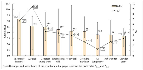 The measured equivalent sound levels and fluctuations of key noise sources in the construction of urban rail transit engineering enclosure structures are shown in Figure 4. With the equivalent continuous sound level generally exceeding 80 dB(A), the peak F-stop generally exceeds 90 dB(A), and some points even exceed 100 dB(A). The sample variance of the studied machinery, except for the pneumatic hammer and the air pick, was below 5.0. By comparing the specific regulations on construction noise control in some countries in Table 5, it is evident that the construction noise of rail transit projects situated in high-density urban areas surpassed the prescribed limit value. Without appropriate noise control measures, the empirical project is at risk of receiving complaints, penalties, and other disputes.