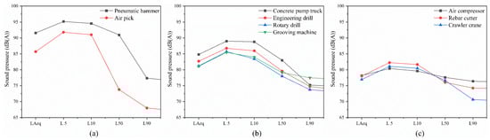 In addition, previous studies have shown that hearing damage would be caused if the occupational noise exposure is above 85 dB(A) [38]; it is likely to increase the risk of hypertension and electrocardiogram abnormalities if the figure is above 80 dB(A) [39]; it is likely to lead to tension or anxiety in people, causing decreased attention, longer reaction times, and increased error rates once the environmental noise is above 75 dB(A) [40]. Therefore, this study subdivided the nine classes of key noise sources into Classes I, II, and III based on noise impact characteristics and further monitored the noise statistical sound level distribution. Figure 5 shows the distribution of the statistical sound levels of the nine key noise sources. The equivalent continuous sound levels of all the noise sources exceed 75 dB(A), which can affect humans to different degrees in physiological or psychological aspects. In addition, most of the noise sources did not show a significant reduction in L50 compared with their equivalent continuous sound levels. This indicates a high proportion of high-intensity noise components in the period of noise emissions and a high overall noise emission intensity.