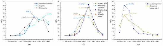 Table 6 shows the representative value of the 1/1-octave spectrum data of the key noise sources. The spectrum energy contribution rate is normalized by Formula (2), as shown in Figure 6. Based on the spectral contribution, the key noise sources in the construction of the urban rail transit engineering enclosure structure can be classified into three classes. The first class comprises high-frequency noise machinery, including pneumatic hammers, air picks, and rebar cutters. Their noise energy distribution ranges from 1000 to 8000 Hz. Among them, the spectral energy contribution (ε-value) of the pneumatic hammers and the rebar cutters peaked at 1 kHz, and the air picks peaked at 4 kHz, which were 26.01%, 24.62%, and 24.85%, respectively. These three types of machinery noise showed high spectral energy contributions at 8 kHz, 15%, 5.64% and 18.42%, respectively. This finding is consistent with the study by Yang et al. [45], which also investigated the energy concentration of light machines like air drills and crushers in the higher frequency range. This type of machinery is characterized by construction processes involving repetitive impacts, vibrations, or cutting. This results in short-wavelength noise that propagates relatively in the environment but has limited ability to pass through obstacles. In addition, the monitoring process of mechanical noise energy in this study is conducted under normal air conditions, while changes in air conditions (such as wind, humidity, temperature, etc.) at the construction site can also alter the propagation characteristics of each mechanical noise energy. Therefore, the air conditions are also critical factors that affect noise propagation and the auditory experience of people in the vicinity.