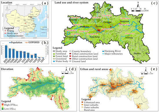 Study area: (a) Location of the Hanzhong Section of the Hanjiang River Basin (HSHRB) in China. (b) Comparison of population size and GDP across the districts and counties within the study area. (c) Land use types in 2020. (d) Elevation. (e) Urban and rural areas.