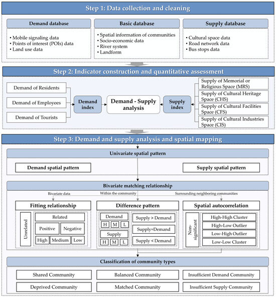 Cultural space (CS) is an important carrier that carries spiritual and cultural values, consolidates urban emotional memory, and serves the cultural life of residents [1]. It is an important part of urban space [2]. At a time when culture has become the global consensus on competitiveness [3], CS is increasingly becoming a key element in improving the quality of life of residents, promoting sustainable community development, and leading urban innovation and prosperity [4]. People’s fundamental needs in production and living have shifted from the material level to spiritual and cultural levels, and the demand for community construction and urban development has also shifted to the culture-led demand for high quality, diversity, and connotation focus. As the elementary unit of urban public activities, community is both the source of vitality of cultural creativity and the core carrier that carries residents’ cultural needs and determines residents’ happiness and sense of belonging. Cities have to provide more public cultural services for social groups to create an urban environment suitable for living and working, and CS—playing an important role in that regard—has become a valuable asset in cities [5]. However, in the context of the continuous growth of cultural demand, the limited supply of CS leads to a significant imbalance and mismatch between demand and supply, and the contradiction between demand and supply intensifies spatial inequality, directly affecting the living standards and quality of different social groups. The question of how to provide fair and equal public cultural services by optimizing the supply of CS to meet the growing spiritual and cultural needs of different groups is a key proposition for the sustainable development of cities and communities. On that account, systematically studying the demand and supply patterns of CS from the perspective of the needs of different groups with community as the research unit is of great significance for comprehensively understanding the spatial matching relationship between the demand side and the supply side of CS, optimizing the spatial distribution of public resources, and enhancing the well-being of community residents.
