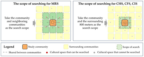 Different types of CS vary in the value and scope of services. MRS serves a significantly larger area than the other types, evidenced by the fact that it takes the surrounding neighboring communities into account in addition to its own. Therefore, this paper defines that, when calculating the supply of MRS in a community, its distribution within the community is calculated based on a comprehensive consideration of its presence in the neighboring communities around it. To calculate the CS supply in the three categories of CHS, CFS, and CIS, the search radius for CS is determined based on a 10 min walking distance for residents, based on domestic and international research and study experience [47]. According to previous scholars’ studies on the distance of residents’ daily walking paths, the community itself and the 800 m buffer zone are taken as the spatial search scope to identify the CS supply [48]; full consideration is given to the radiation effect on this community of CS within 800 m outside the community (Figure 3).