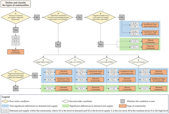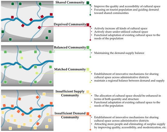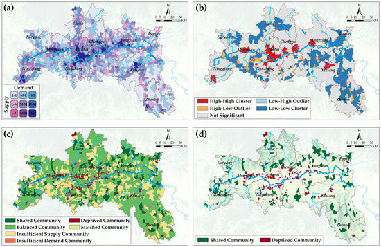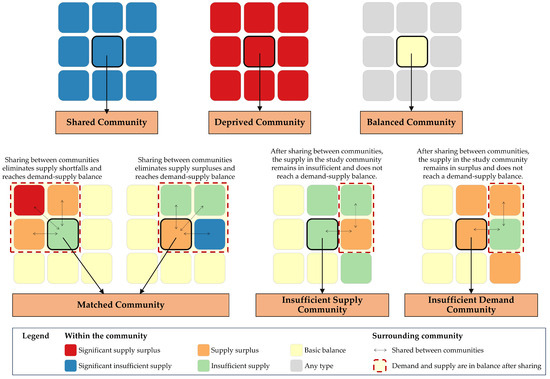 According to the division of technical processes by community type, coupled with the bivariate mapping and Bi-LISA map of demand–supply, and the significance of the difference between CS demand and supply, the communities within the study area are classified into six types of communities. The order from significant surplus of supply to balanced demand and supply to significant shortage of supply is as follows: shared communities, insufficient-demand communities, balanced communities, matched communities, insufficient-supply communities, and deprived communities.