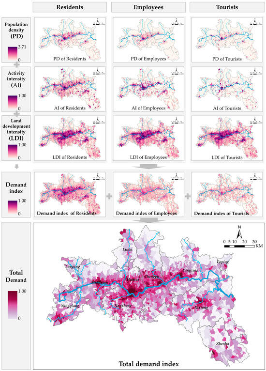 The three columns of the small graphs in Figure 5 show the calculation process and the results of the CS demand indices for the three groups of people—residents, employees, and tourists, respectively. The graph at the bottom, the spatial distribution of the overall demand index, is derived from the CS demand indices of the three groups.