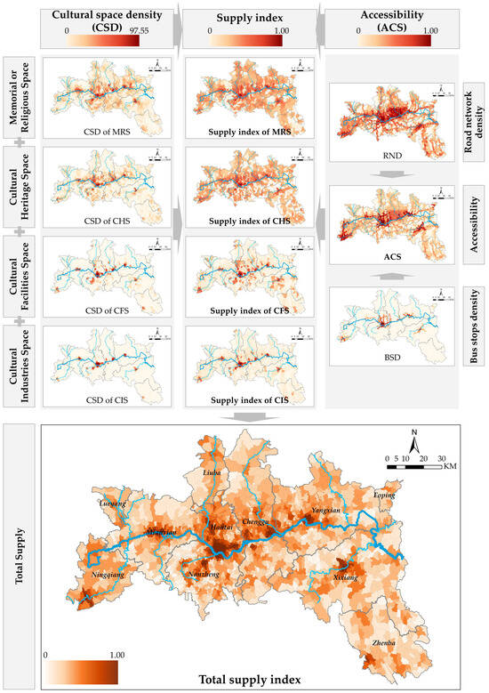 The small graphs in Figure 6 show the calculation process and results of the supply indices of the four CS types: MRS, CHS, CFS, and CIS. The supply indexes for the four CS types were used to produce the bottom graph, that is, the spatial distribution of the overall supply index.
