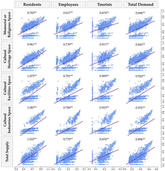 The scatter plot matrix of demand–supply can reflect the correlation between the demand of three groups and the supply of the four types of CS (Figure 7). The results showed that there was a significant positive correlation between CS demand and CS supply for all groups, i.e., communities with high demand from all groups of people had high supply indexes.