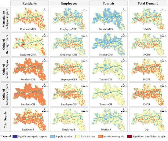 The difference between overall demand and overall supply in the HSHRB of communities was dominated by demand–supply balance and lagging supply. There were 1562 communities with balanced demand and supply, accounting for 76.64% of the total number of communities; 337 communities with lagging supply, accounting for 16.54% of the total number of communities; 134 communities with surplus supply, accounting for 6.58% of the total number of communities; and 5 communities with a significant surplus of supply, accounting for 0.25% of the total number of communities. Communities with balanced demand and supply were evenly distributed spatially; communities with lagging supply were mostly scattered in the suburbs and rural areas south of the main stream of the Hanjiang River; and communities with surplus supply were in a small number of outlying rural areas. The difference between the demand and supply of CS for residents, employees, and tourists was characterized by lagging supply, balanced demand and supply, and surplus supply. The specific details for this are outlined below.