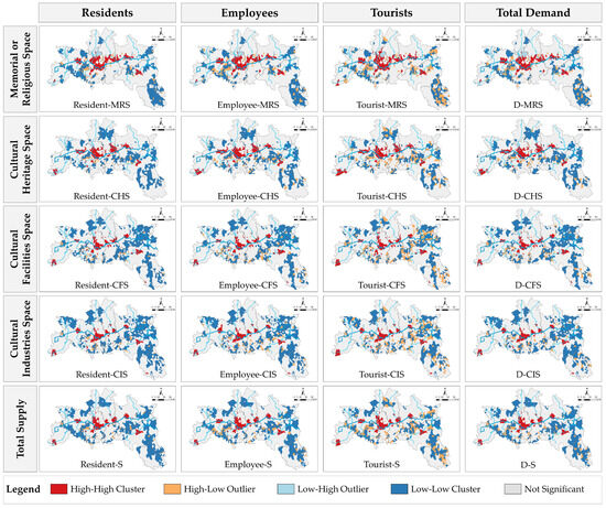 We established a spatial weight matrix based on the GeoDa spatial analysis tool and calculated the global Moran’s I between the CS demand of three groups of people and the CS supply environment of four types. As shown in Table 3, Moran’s I between CS demand and CS supply environment for all groups was positive and significant at the 0.001 level, a finding that reveals a significant positive spatial autocorrelation between them. In addition, Moran’s I values of CS supply environment and population demand vary from high values to low values for residents, employees, and tourists. This result shows that the spatial supply environment of CS has the highest positive correlation with the demand of residents, followed by the employees, and the spatial positive correlation with the demand of tourists is the lowest.