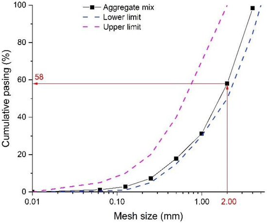 Locally available raw materials were used in order to minimize transport costs for long distances. Ordinary Portland cement of grade 32.5 (C 32.5) was applied with a rapid increase in strength and standard requirements according to EN 197-1 [36]. The oxide composition and main material properties provided by the manufacturer (Heidelberg Materials CZ, Corp., Czech Republic) are provided in Table 1 and Table 2. As a filler material, a blend of mined natural silica sand in the fraction 0/2 mm (N-A 0/2 mm)—LB MINERALS, Ltd., Horní Bříza, Czech Republic—and natural crushed fine silica aggregate in the fraction 2/4 mm (N-A 2/4 mm)—Kámen a písek, Ltd., Český Krumlov, Czech Republic—was used. The particle size distribution curve of the used aggregated blend is depicted in Figure 1. The cumulative particle size distribution curve fell within the highlighted lower and upper limit curves that indicate an optimal granulometry area suitable for the design of mixed cement bases, as indicated in EN 206-1 [37].