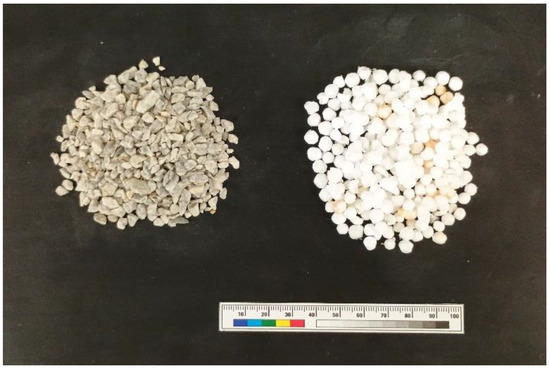 The coarser fraction of natural aggregate N-A 2/4 mm was substituted via detached beads of waste-expanded polystyrene of the same fraction (W-A 2/4 mm) up to 100 vol.% (see in Figure 2). Waste polystyrene particles produced from recycled EPS boards from thermal insulating layers of buildings’ envelopes, constituting a sustainable material source, were provided by the company Ecopolystyren, Ltd., Příbram, Czech Republic.