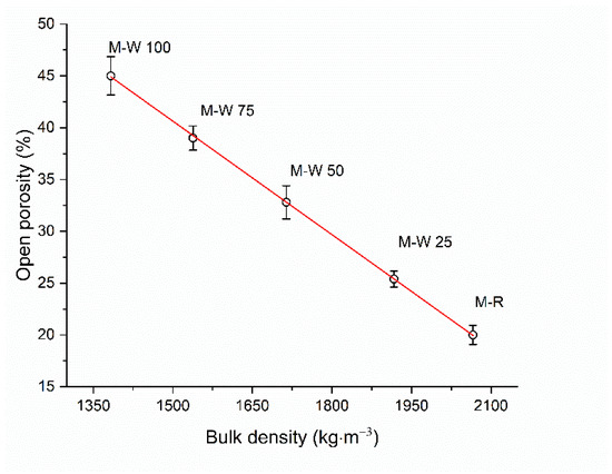 Bulk density versus open porosity relationship obtained for reference (M-R) and M-W 25−100 mortars.
