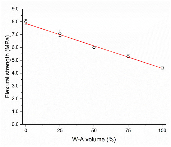 Strength-related properties are the most important for cement-based composites, particularly when a load-bearing function of concrete or mortar layers is expected. The mechanical properties of the W-A dose hardened the mortars, as depicted in Figure 4 and Figure 5. In line with the increasing porosity of the hardened mortars, the flexural strengths were found to gradually linearly (R2 = 0.993) decrease with the increasing content of waste aggregate. Thus, a minimum average flexural strength of 4.4 MPa was recorded for the material with a full volumetric content of W-A 2/4 mm. The rest of the tested hardened mortars, M-W 25–M-W 75, reached 0.9, 2.0, and 2.7 MPa lower strengths compared to the reference mortar (M-R). Similar results were also achieved in other works dealing with the addition of particulate plastic material into cement-based composites [56,57,58].