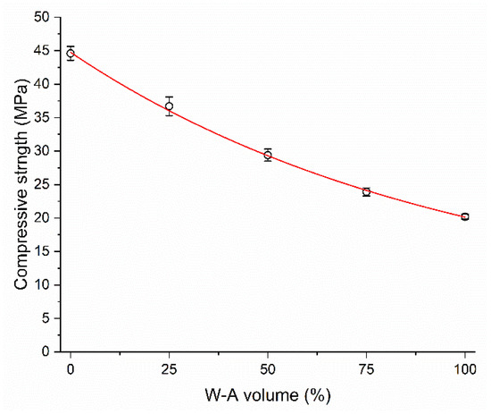 The compressive strength development is plotted in Figure 6. Again, the gradual linear (R2 = 0.999) decrease in strength with increased dosages of WA is shown. Compared with the dense reference material, the decrease in compressive strength values reached 7.9, 15.2, 20.7, and even 24.4% for samples M-W 25, M-W 50, M-W 75, and M-W 100. The observed trends fulfill the previous conclusions reported in works investigating the utilization of polymeric materials in cement-based composites [3,32,59]. Expanded thermoplastic materials are characterized by their soft matrixes filled with a high number of closed air pores. So, because of their small mechanical strength in the range of tens (in relation to the maximum of hundreds of kPa [60,61]), EPS beads represent a very fragile material that is susceptible to easy failure under loading in a hardened composite matrix [8,62]. However, even with the full volumetric replacement of the natural aggregate with a fraction of EPS beads at 2/4 mm, it was still possible to achieve mortars with 20 MPa of compressive strength. Such mortars still have sufficient bearing capacity [63]. In addition, Babu et al. reported that cement-based composites with an EPS content result in materials with higher strength properties compared with those filled with other artificial aggregates, like perlite or vermiculite [8].