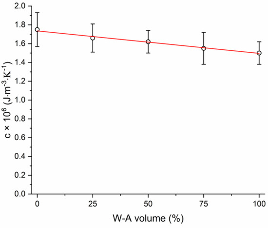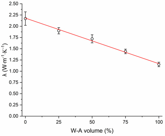 Hardened cement-based composites with reduced bulk density due to the utilization of alternative materials in their composition may bring benefits—not only in mitigating the dead load of structures, but also in improving their thermal performance, as visualized in Figure 6 (thermal transport) and Figure 7 (thermal energy accumulation). The substitution of traditionally used fine filler with the waste alternative caused a gradual linear (R2 = 0.992) decrease in the thermal conductivity values measured in hardened dried mortars. The highest-value thermal transport rate of 2.17 W·m−1·K−1 was observed for the reference sample (M-R). In other cases, for the mortars labelled M-W 25 to M-W 100, values gradually decreased by 12.4, 20.7, and 33.6, up to 47.0%. Accordingly, thermal conductivity decreased more than 1.0 W·m−1·K−1 for the material without the presence of natural filler N-A 2/4 mm. Such a thermal conductivity reduction can be achieved by assuming evenly distributed lightweight aggregate particles in hardened cement-based matrixes [64]. Demirboga and Kan reported that the thermal conductivity reduction can reach 43–70% depending on the lightness of the polystyrene aggregate concrete [65]. However, including soft plastic materials in the hardened matrixes of the designed mortars negatively influenced their thermal accumulation, as visualized in Figure 7. A linear decrease (R2 = 0.983) in the observed property was recorded. Nonetheless, the maximum loss of heat capacity was only 14.3% and, at the same time, a significant reduction in thermal conductivity was reached. An explanation of the role of EPS beads in the thermal performance of hardened mortars can be found in their 150 times lower bulk density compared with N-A 2/4 mm. Moreover, the air contained in the EPS closed-cell structures does not contribute to the heat accumulation in the hardened matrix, as proven by the data presented in Table 4.