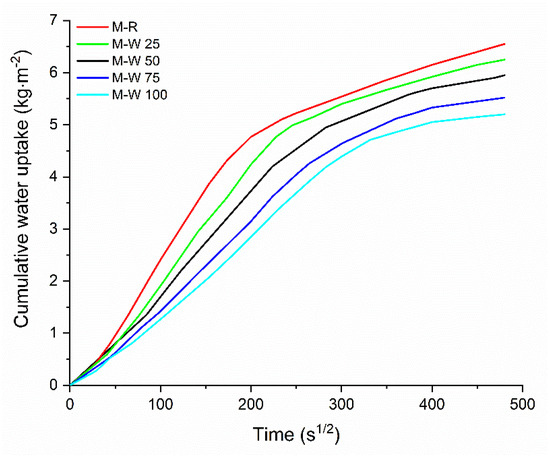 Cumulative water uptake measured on samples of reference mortar (M-R) and W-A 2/4 mm dosed mortars.