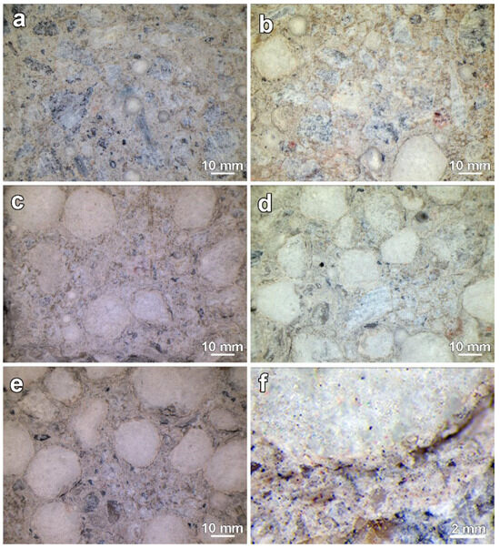 Series of images from the digital microscope: (a) reference mortar (M-R), (b) M-W 25, (c) M-W 50, (d) M-W 75, (e) M-W 100, and the interfacial transition zone between an EPS particle and cement matrix at higher magnification (f).