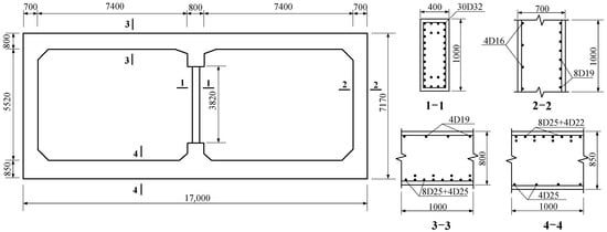 This paper takes the Daikai station, damaged in the 1995 Kobe Earthquake, as its research subject. According to the investigation [], the station had a cross-sectional dimension of 17 m × 7.17 m, a top slab thickness of 0.8 m, a bottom slab thickness of 0.85 m, and a side wall thickness of 0.7 m. The cross-sectional dimensions of the central columns were 0.4 m × 1.0 m, with a longitudinal spacing of 3.5 m and an effective height of 3.82 m. The main section dimensions and reinforcement details are shown in Figure 1. The concrete strength of the central columns was 23.52 MPa, while the concrete strength of the other parts of the structure was 20.58 MPa. In this paper, the station structure is considered to be buried to a depth of 4 m.
