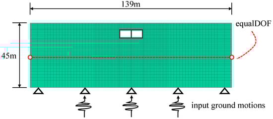 The horizontal and vertical displacements were fixed at the bottom surface, while the ground surface of the structure was free. Using the equalDOF command, horizontal kinematic constraints were introduced to the nodes on two side boundaries in order to ensure the same horizontal movement of the two nodes at the same burial depth, which effectively simulates the shear deformations of the soil layers under upward propagation of in-plane waves [].